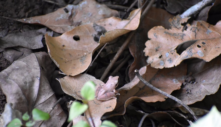 a tiny frog sits on a leaf on the forest floor