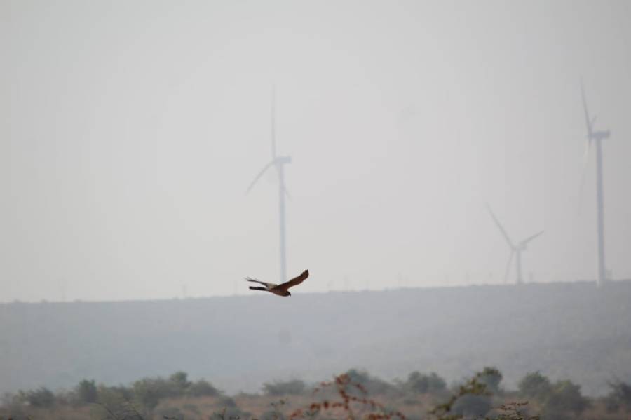 A pied harrier (Circus melanoleucos) flies above the scrublands surrounding Gandikota. Note the windmills in the background (P.C. Dincy M)