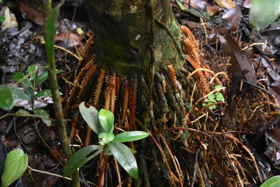 Stilt roots, often associated with mangroves, are seen in Myristica trees as an adaptation for life in a wetland Previous image Next image