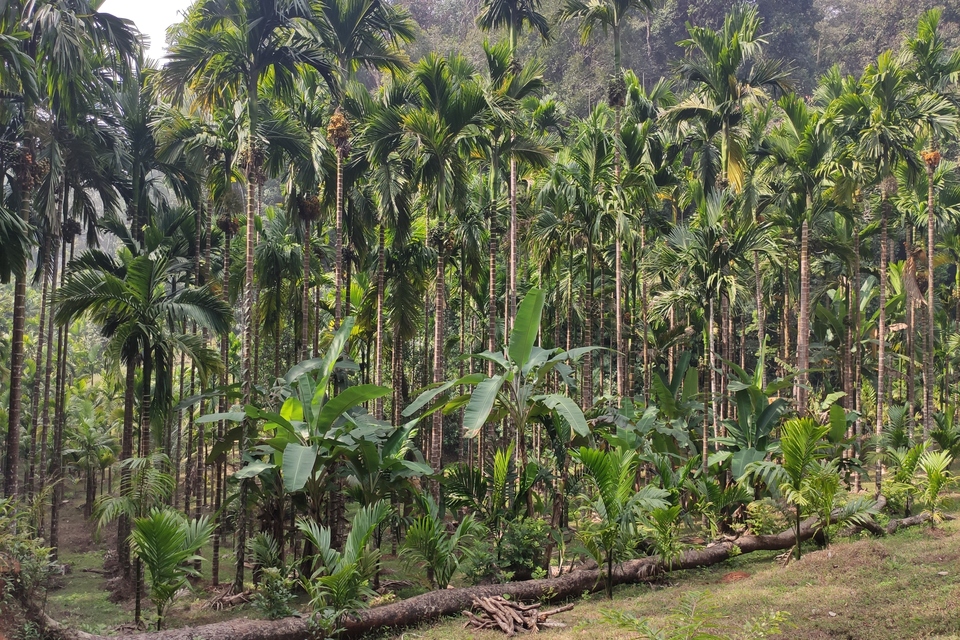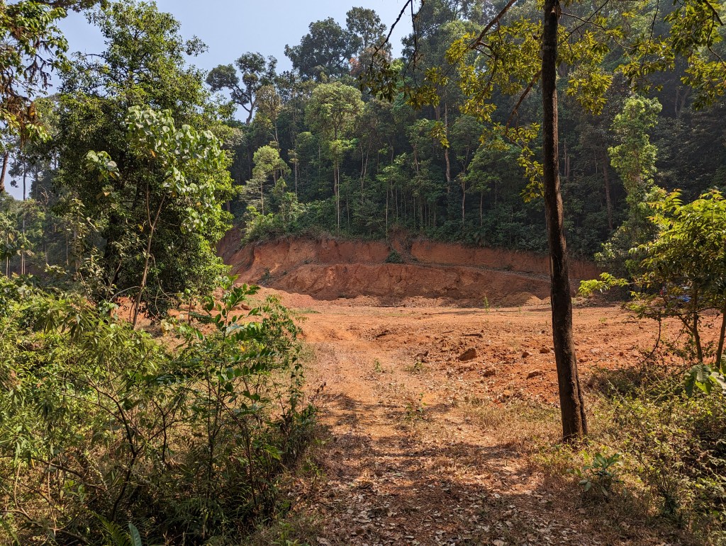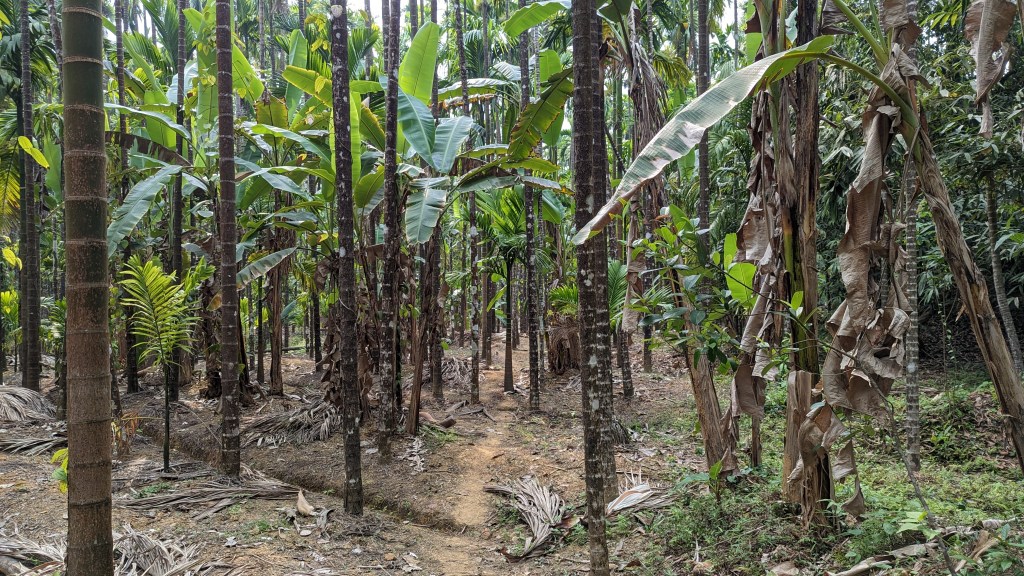 Naturally, an elderly man pokes his head out of his house and inquires as to our purpose there. We ask for directions to the swamp and he points down another dirt path that leads into his areca fields, clearly losing interest in us. The people in this village are used to mad scientists showing up in search of swamps – I am not the first to tread these forest paths nor will I likely be the last. We kick the bike into motion, weaving down the rocky path once more. The air cools slightly, an indicator that the forest is near. In most parts of this landscape, we can see the forest, but an imposing array of areca lies in between the road and the evergreen trees, a maze of sorts that we have to cross. Here, in Torme, the areca fields are busy. Workers on JCPs collect reddish soil (I have a sneaking suspicion this is coming from the forest but guard my tongue) and deposit it around the young areca trees, creating irrigation channels. Areca is a water intensive crop, placing it in direct conflict with swamps, which are often the source of water for areca fields in Uttara Kannada.