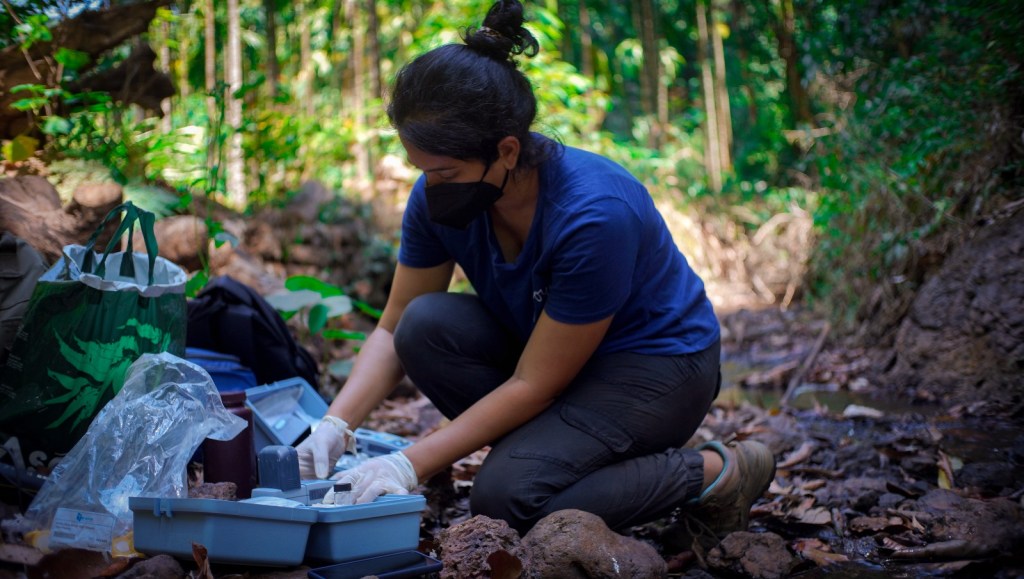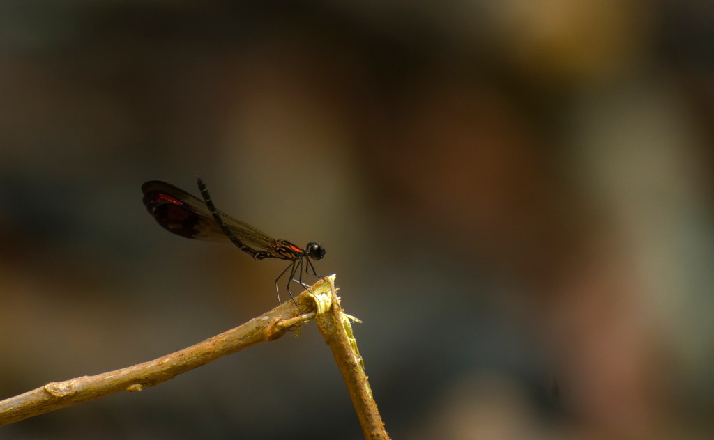 I place a hand on the logs, a silent goodbye to my old friend, and step further into the swamp. Broken reeds and fallen Pandanus indicates that people have traipsed through here before. I spot a few gaur hoofprints. A creature as big as a gaur can create a huge ripple in the delicate swamp ecosystem, but they belong here. Tiny frogs hop away from my feet. The krrrr-krrr-krrrr of a tree frog cuts through the trickling of the water. The wind rushes wsssha-wsssha-wssssha through the large-leaved trees and a sudden rustling in the thick undergrowth makes me still, watching out for movement. Wildlife still lives in Torme – barking deer, lion-tailed macaques, bonnet macaques, grey langurs, mouse deer, gaur, civets, giant squirrels, and even the occasional leopard have been recorded in this swamp. Rohan is slowly making his way up the swamp surveying for odonates. Damselflies and dragonflies serve as indicator species for swamp health, as they are impacted by even the tiniest shifts in water quality and habitat fragmentation. In Torme, I am sure they are scarce.