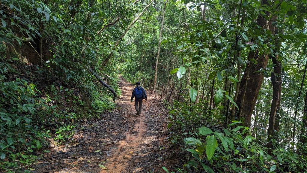 The mud path abruptly narrows and we brake sharply. Looks like the car won’t go any further. We park it off the path in some shrubby vegetation, narrowly avoiding an army of procession ants (never ever let these little guys bite you; you’ll be itching for days) as we climb out and tie on our hiking shoes. The monsoon air is humid but cool, as the morning sun is still yet to toast us. We begin the hike down the steep, slippery mud path. The faint tracks of motorcycles intersperses with the fresh hoofprints of cattle. A few larger ones could be gaur, or Indian bison. The hush-hush of the breeze caressing the trees – moist deciduous in this part of the forest – reminds me of the old folk story about the whispering woods where the trees spoke to one another. Rustling underbrush has me glancing to my right; it is only a jungle fowl pecking about.