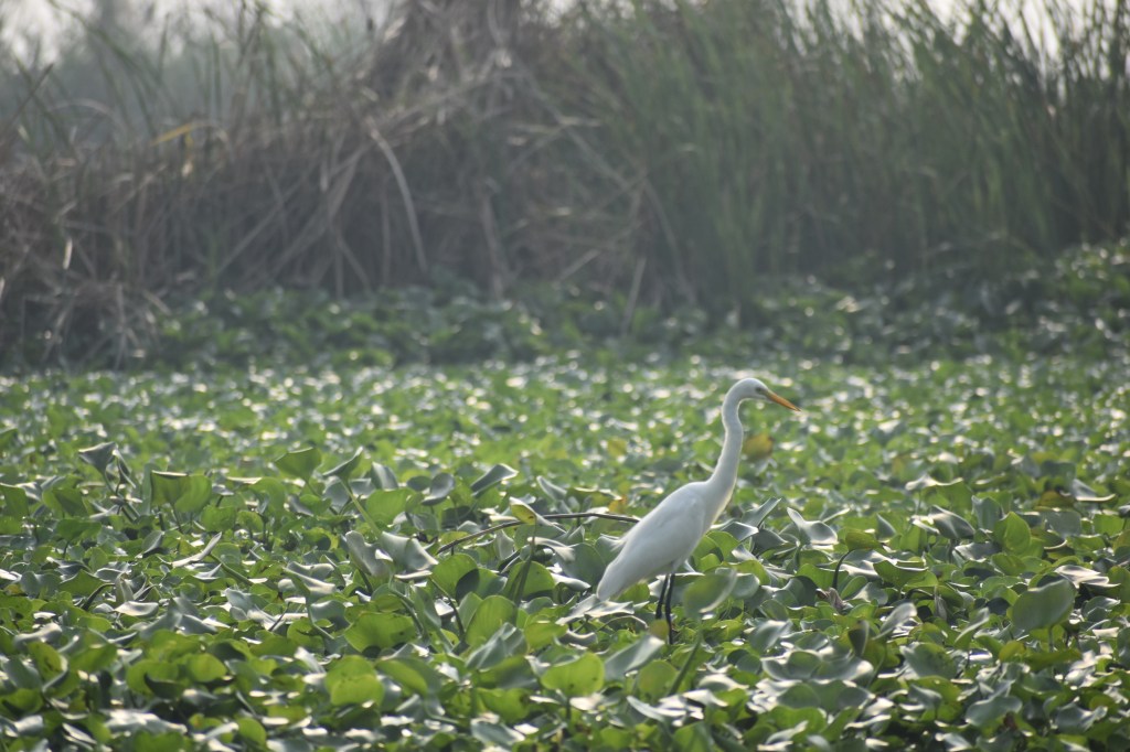 A sea of green broad leaves. Pale purple flowers pop up on occasion. A pond heron stands perfectly still on this mat of greenery. The blue waters are barely visible. Water hyacinth. It grows voraciously, swallowing the river, clogging the channel, and tangling in the boat’s propeller.