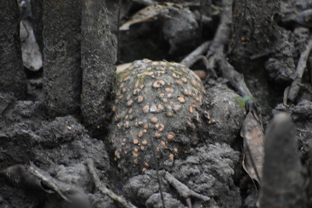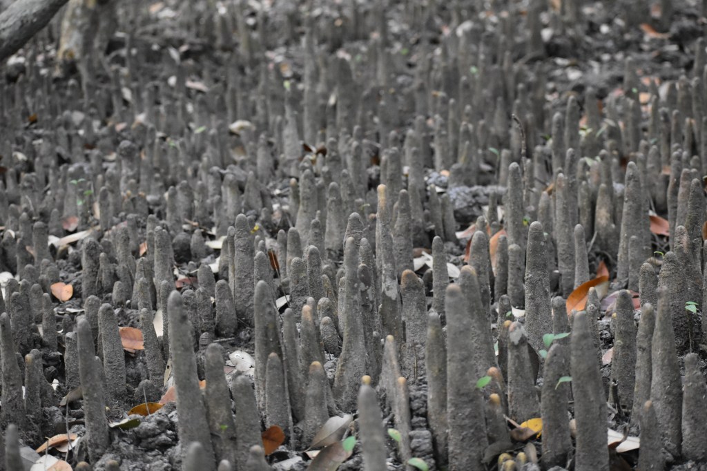I cannot help but notice the differences between these roots and the ones I see in Myristica swamps. In my study sites, the common adaptive roots are stilt roots and knee roots. Here, in the depths of this mangrove forest, I have already recorded many types of roots: buttress roots, stilt roots, knee roots, peg roots (pneumatophores), and snake roots. The sheer variety is astounding. Even the knee and stilt roots look different in mangroves vs. Myristica swamps; in mangroves, there is no gap below the knee root as seen in Myristica swamps. Perhaps the constant flushing of water in and out with the tide allows for sediment buildup and trapping on the inland side of the roots, filling in the gap. In Myristica swamps, the constant rushing of streamwater has prevented sediment trapping, maintaining the arching gaps beneath each knee root. Or maybe the mangrove soils are thicker, and the roots barely protrude out from the soil, whereas in Myristica swamps, due to a high water table, the soil layer is thin and the roots protrude further. Only research will shed light on this, I suppose…