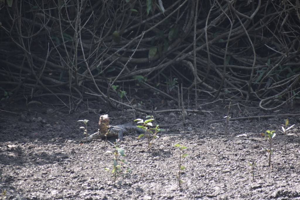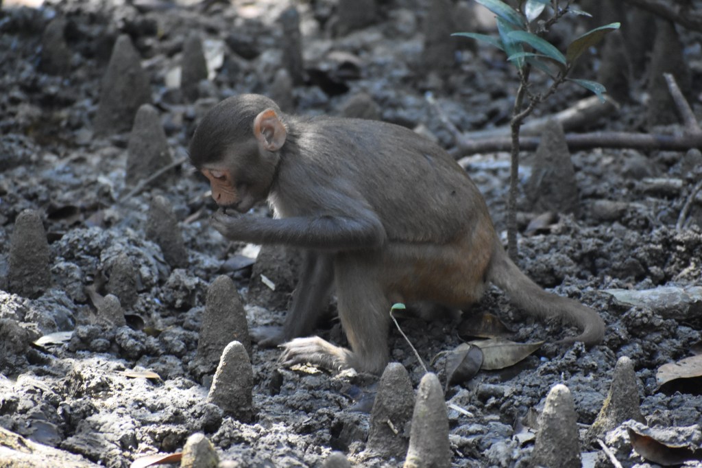 We dock the boat at a floating jetty and climb ashore. Here, the Forest Department has created a mangrove boardwalk, just like the one in Honnavara that I always wanted to visit (but have never managed to see…). Workers are still extracting mud to build the boardwalk, and monkeys squabble over leftover rice from their meal. We wobble over pneumatophores and buttress roots, indicators of a Xylocarpus-Sundari forest. Dr. Hazra tells us that Sundari trees are highly coveted for their wood, which is used in building furniture and devghars (home temples). It merits a mention in ancient Hindu texts as well.