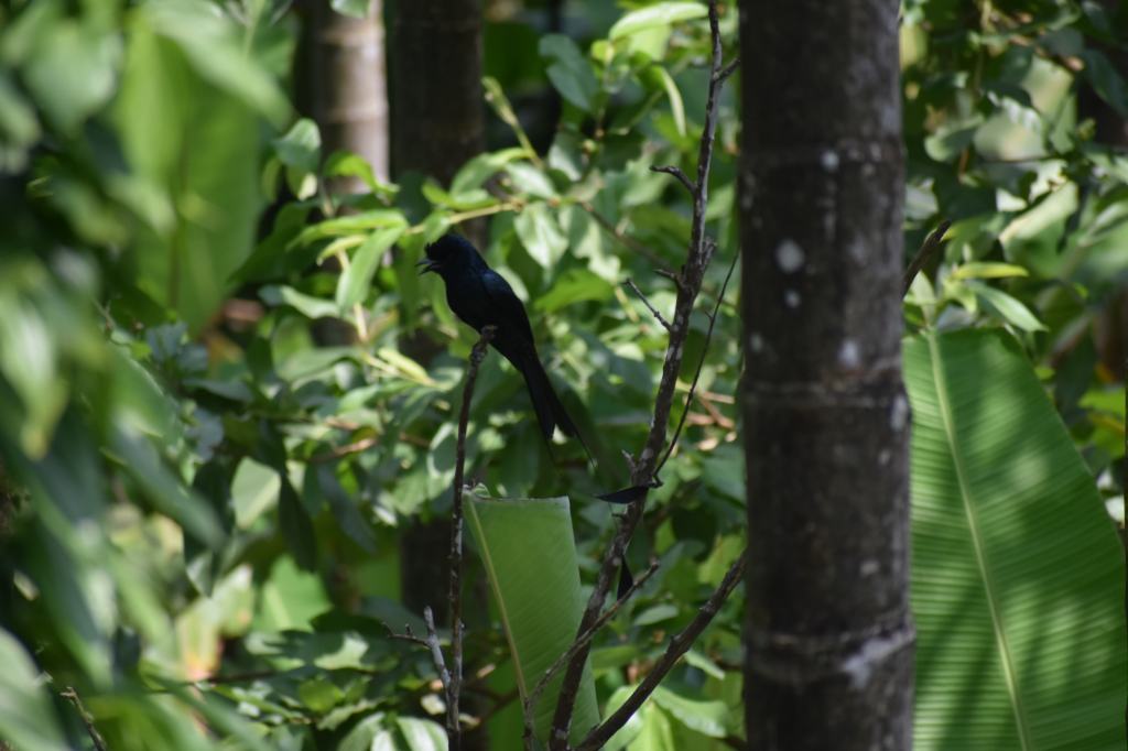 I am suddenly distracted by a smaller yet rowdier visitor – a racket-tailed drongo. Drongos are excellent mimics, and this one seems to have it out for the hornbill. It perches on a low branch of a banana tree (the understory of most arecanut plantations in this landscape is comprised of banana, black pepper, cardamom, and vanilla) and begins to make a hoarse cackling sound. Both the hornbill and I glare at this perky visitor; the drongo is mimicking the call of a female Malabar grey hornbill, an act that is clearly not endearing it to the male perched nearby. The hornbill bobs its head a few times and the drongo increases the volume of its mimicry. Conceding defeat, the hornbill spreads its white-tipped wings and sails off to a different tree. The drongo begins to preen its shiny black feathers, cheerfully unrepentent.